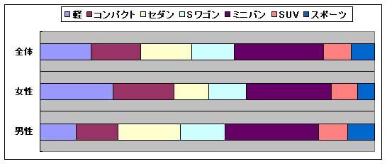 ⇒ 男性はセダン・ミニバン、女性は軽自動車・コンパクトの保有比率が高い。